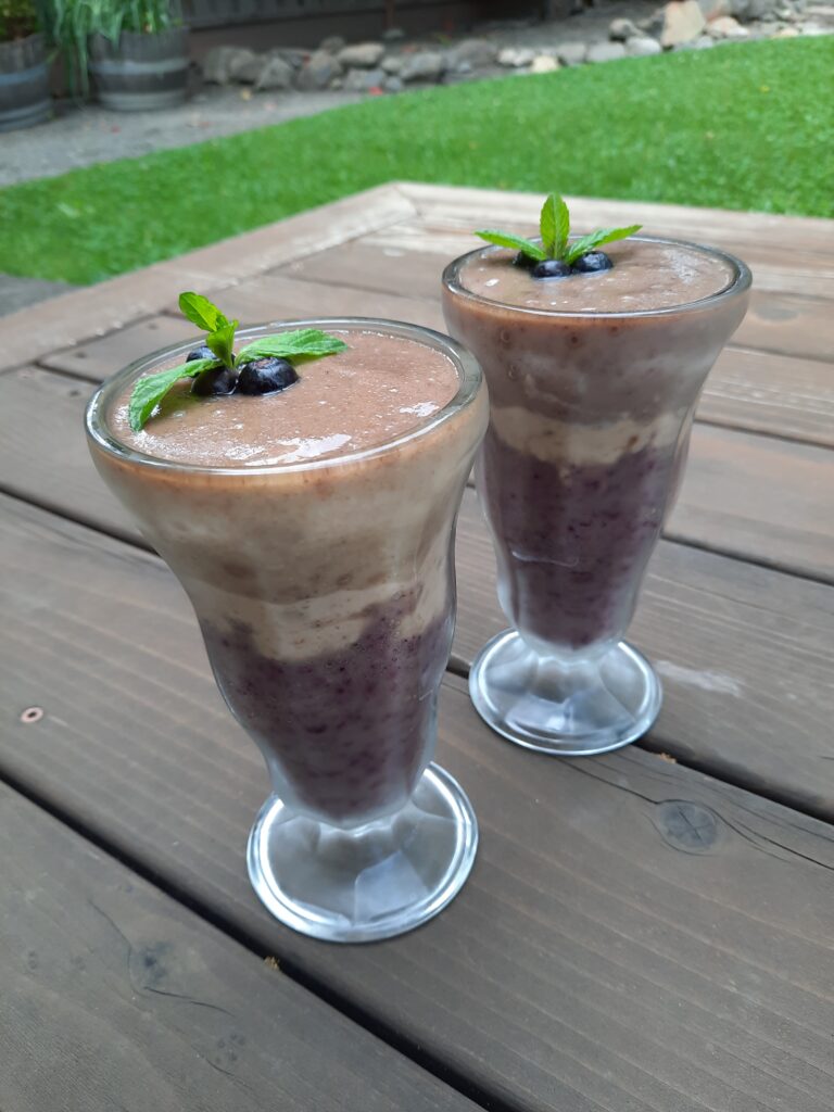 Blend the remaining banana mixture with the blueberries and then pour into the parfait glass on top of the date-walnut-banana mixture. Garnish with mint or leafy green/fruit of your choice.