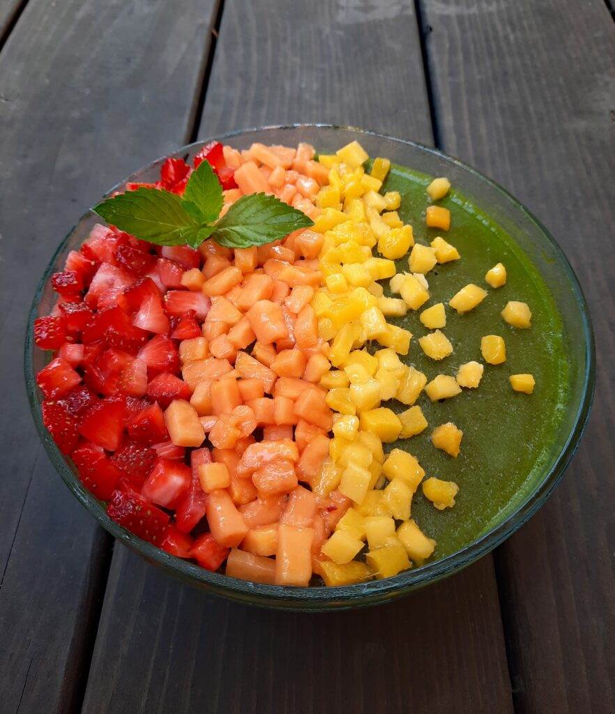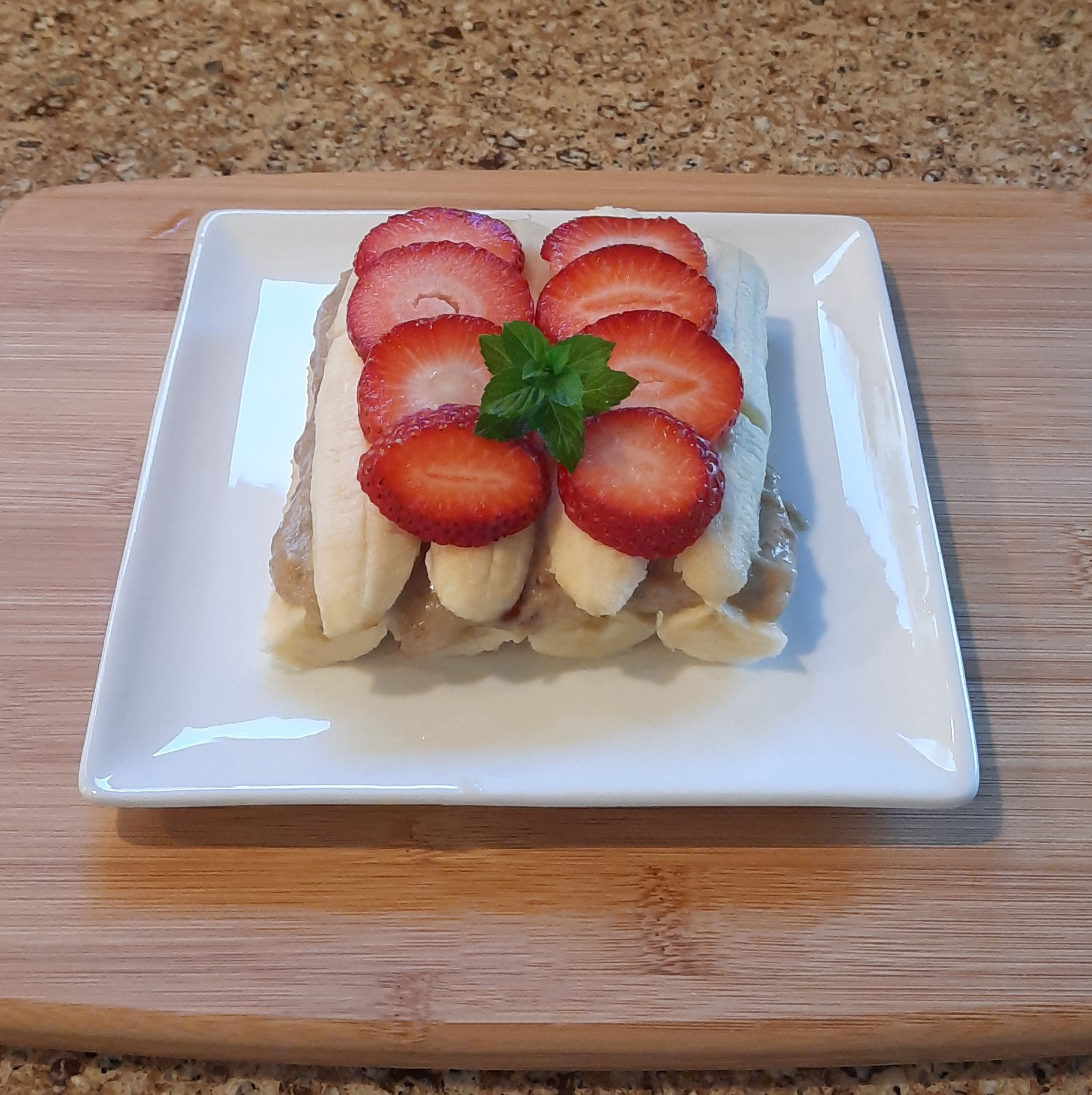 Slice strawberries (or raspberries) and arrange on top of the bananas. You can add a mint sprig if desired.