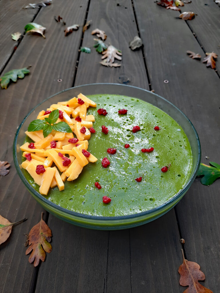 The dandelion greens I planted last spring are still growing well in my garden, despite it being late December, so today I picked a large handful and put them in this smoothie: