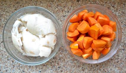 To make this recipe, blend ½ of one banana with the walnuts and date. You can add a little water if the mixture is too thick. Set aside.
