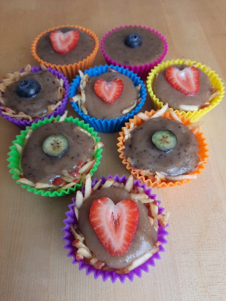 Clean blender and add the remaining banana date mixture and 4 rinsed blueberries to the blender. Blend until smooth and immediately pour mixture into remaining apple-lined cupcake cups. Cover and refrigerate for at least 8 hours. This amount of time will allow the cupcakes to become firm enough to be removed from the cupcake cups. Freezing for 3 to 4 hours works well too. Add strawberry and blueberry garnish/design to top of the cupcakes right before serving.