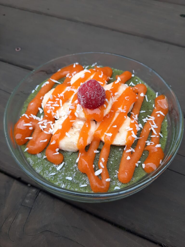 By the way, this smoothie was really good! It is made of 2 ½ bananas, 2 cups of dandelion greens, and 2 oranges. The design on the top is composed of ½ of one banana cut into slices, ½ of one ripe persimmon, one small strawberry, and 1/8 tsp. of coconut flakes.