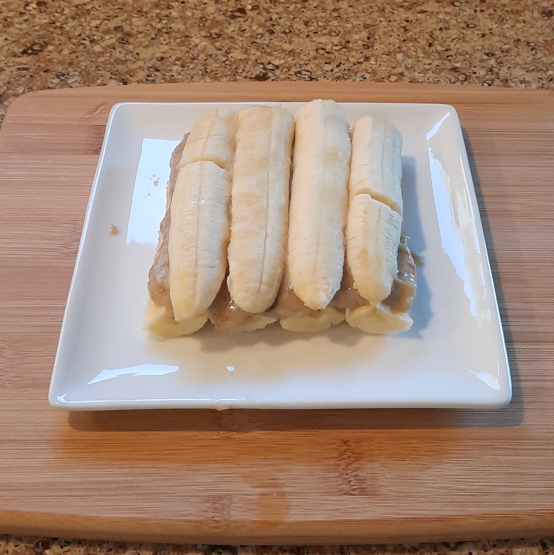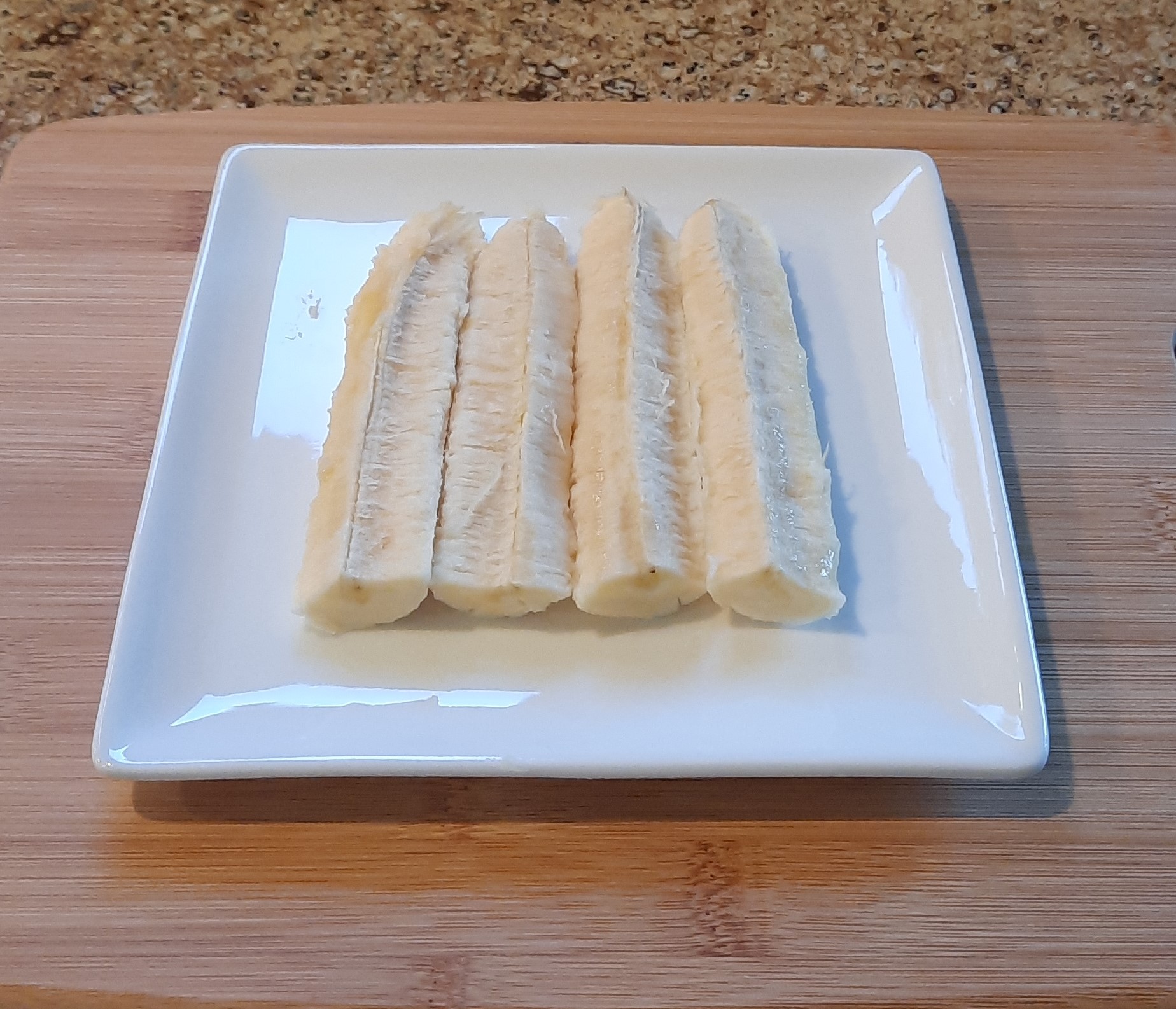 Peel bananas and cut each of them in half. Then pull them apart into their individual three sections – you should now have 12 banana sections (6 for each banana). Line up 4 banana sections on a plate as shown in the photo: